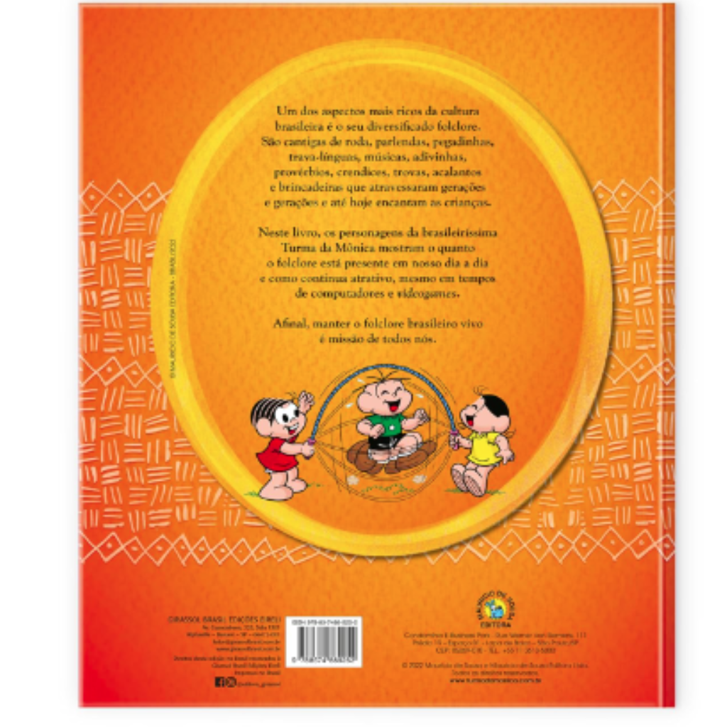 Um dos aspectos mais ricos da cultura brasileira é o seu diversificado folclore. São cantigas de roda, parlendas, pegadinhas, trava-línguas, músicas, adivinhas, provérbios, crendices, trovas, acalantos e brincadeiras que atravessaram gerações e gerações e até hoje encantam as crianças. Neste livro, os personagens da brasileiríssima Turma da Mônica mostram o quanto o folclore está presente no nosso dia a dia e como continua atrativo, mesmo em tempos de computadores e videogames. Afinal, manter o folclore brasileiro vivo é missão de todos nós. Este livro já se tornou um clássico mais que indispensável! Vem ainda com um guia do professor ao final do livro com muitas divas de atividades para desenvolver com os pequenos e trabalhar de forma interdisciplinar. Conteúdo especialmente desenvolvido com curadoria psicopedagógica.
